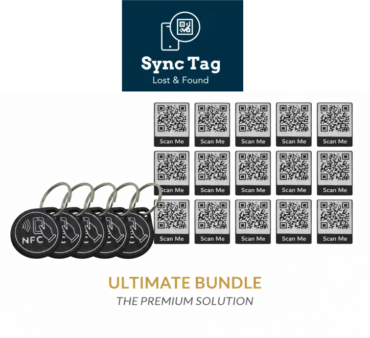 Includes 12 waterproof QR stickers + 5 durable NFC tag. Protect your keys, phone, and bag — everything you need to start securing your valuables with SyncTag’s lost & found network.